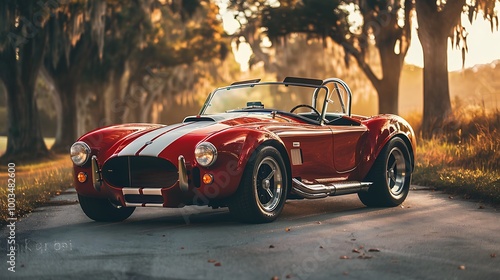 Red Cobra sports car parked on country road with golden light of setting sun for sleek design and dynamic automotive performance concept.