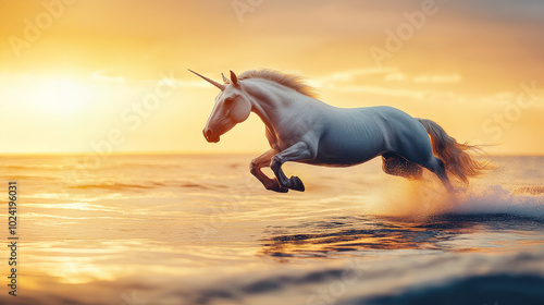 A unicorn majestically gallops across the reflective ocean at sunrise, embodying magic and wonder.