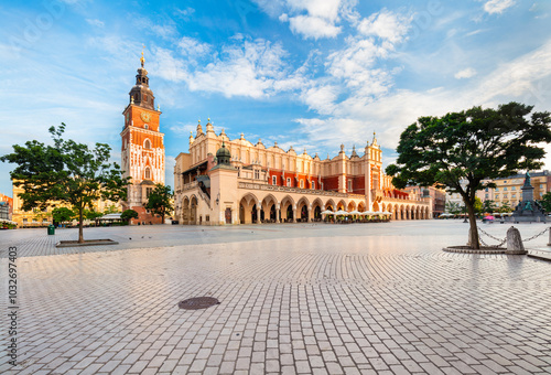 Old town and Cloth hall in Cracow, Poland, empty market square at sunrise