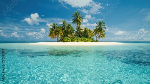 Vacation on a deserted tropical island with clear blue waters.