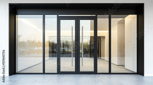 Modern black aluminium glass door isolated on white background, Shopfront entrance open window frame for interior store design