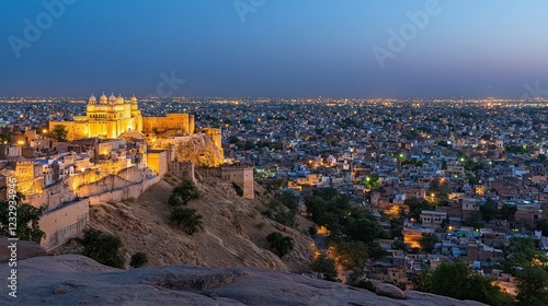 Illuminated Mehrangarh Fort overlooking Jodhpur city at night
