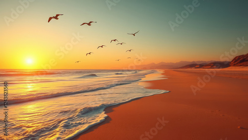 Warm sandy beach at sunset with few seagulls flying overhead, ocean waves, tropical background, beach sunsets