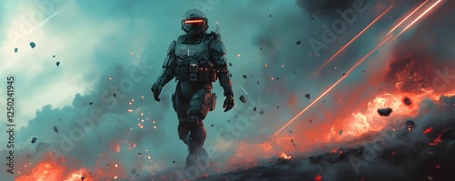 A futuristic soldier in advanced power armor, walking through a battlefield filled with laser beams and explosions