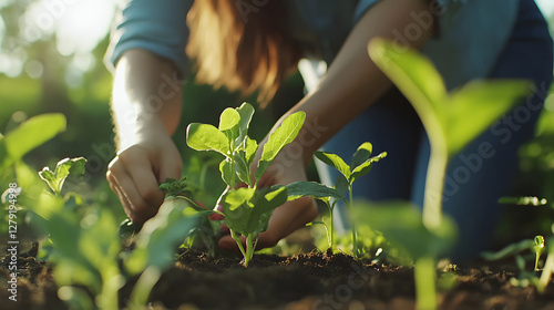 Farmer's hands close-up and soil with plants. Agriculture Care