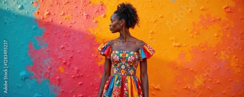 Fashionable woman wearing a unique dress standing in front of a colorful background , design, indie, fashion