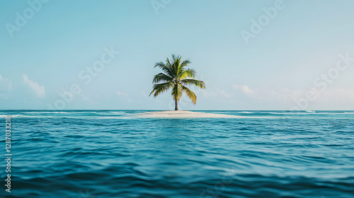 A small deserted island with a single palm tree in the middle of the vast ocean surrounded by gentle waves.