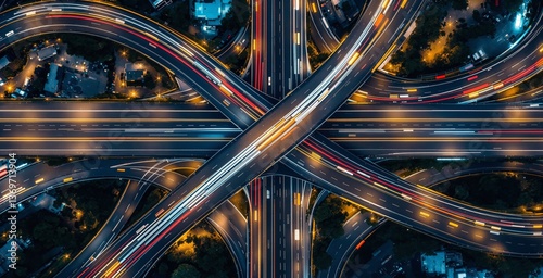 Complex highway interchange with colorful light trails, futuristic design style, night urban background, concept of modern transport infrastructure. Ai generative