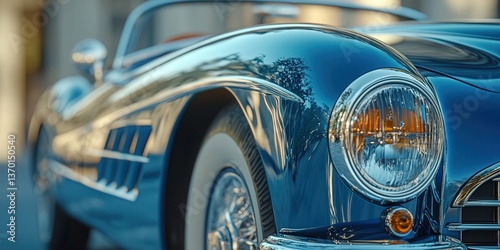 Close-up of a vintage blue classic car with gleaming chrome details and whitewall tires, reflecting a sunny day.
