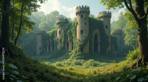 Majestic castle ruins in lush, overgrown forest setting. Crumbling towers and walls covered in vines and vegetation. Mystical, fairy tale background