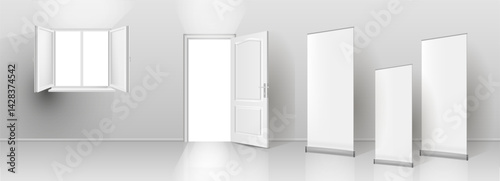 A pillar and a white plastic window frame on a neutral background. Wide realistic open window with slopes and window sill, office. Layout of a template for interior design. Vector illustration