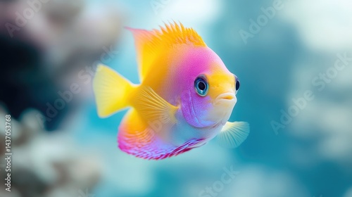 Colorful Angelfish in Vibrant Reef, High-detail Soft Focus, Side Profile Close-up, Fin Details Visible, Swimming Gracefully, Ocean Background, Bright Pastel Hues, Perfect for Aquarium Ads