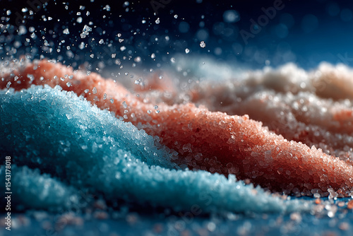 Paski kolorowych kryształków, wyglądających jak cukier lub sól, z efektem sypania się i rozświetlenia. Abstrakcyjna kompozycja tekstury i koloru.