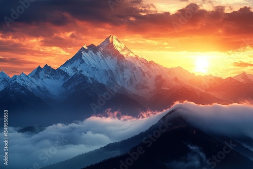 Majestic mountain peak bathed in fiery sunset. Clouds swirl around foothills