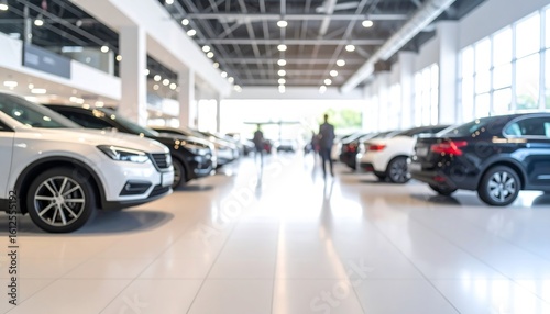 Blurred view of a spacious car showroom with rows of vehicles and people walking
