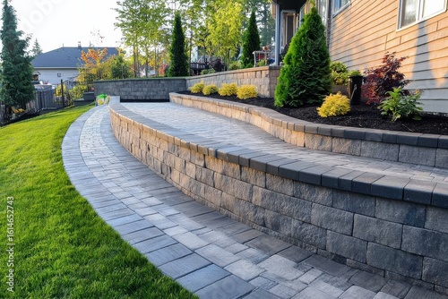 Transform your garden with a landscaped patio, complete with a practical retaining wall and patterned pavers.