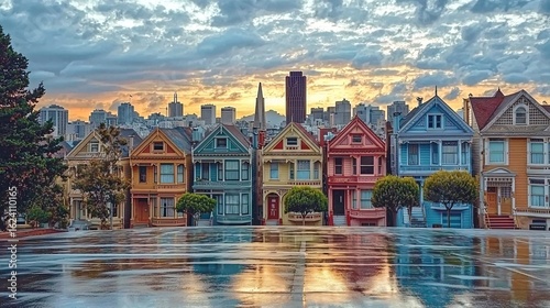 Colorful Victorian Houses with City Skyline at Sunset Reflections