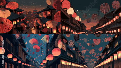 Beautiful illustrations of Japanese streets decorated with traditional lanterns and umbrellas during a nighttime festival atmosphere.