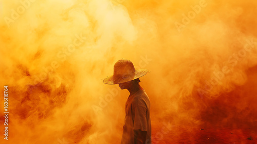 Bathed in the golden haze, she stands where water meets fire in the sky.