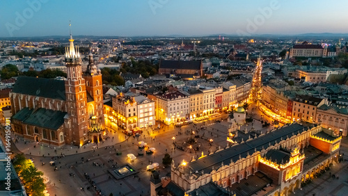 aerial view over central square of krakow in evening at sunset in poland
