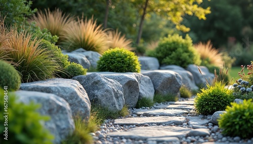 Grey boulder rock garden landscape design features stone pathway lined with green bushes, ornamental grasses. Natural stone elements create serene outdoor space, perfect for tranquil garden planning,