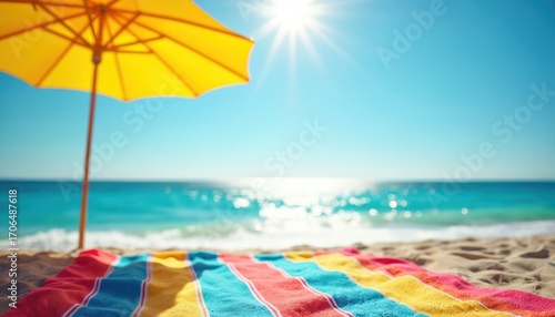 Colorful beach towel spread on sand under sunny umbrella by sparkling ocean, evoking summer vibes. Bright blue sky meets turquoise water horizon. Peaceful seashore scene, no people, pure relaxation,
