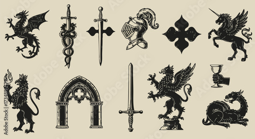 Medieval heraldic elements featuring dragon sword unicorn griffin and other symbols
