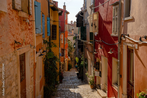 Rovinj, Croatia - August 15, 2025: Colorful Alley in Rovinj – a narrow cobblestone street lined with vivid red, orange, and yellow facades, wooden shutters, and hanging lamps in the old town.