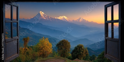 Majestic mountain peaks visible through an open window at sunrise.