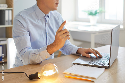 Young intelligent businessman with laptop, paper and glowing light bulb changes marketing plan using genius brain, knowledge and new smart ideas. Business creativity, technology, inspiration concept