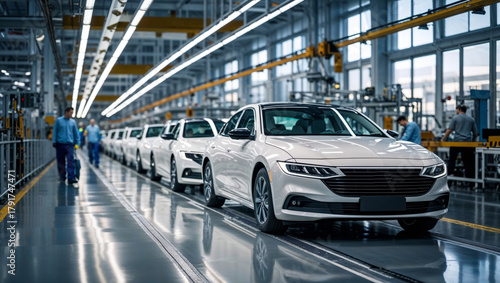 New cars rolling off the assembly line in a modern automotive factory