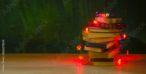 giving books for christmas,christmas gift,present,reading,literature,education, christmas,holiday concept with heap of books, christmas lights and decoration