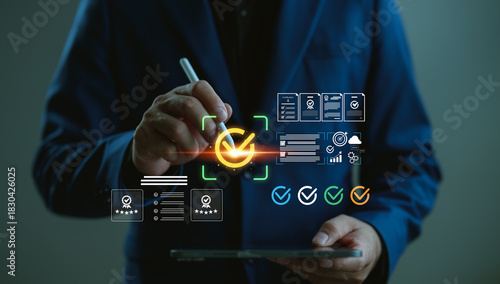 Businessman using digital certification and quality assurance interface. Concept of standardization, compliance, document approval, verified checkmark, audit process, and digital validation system.