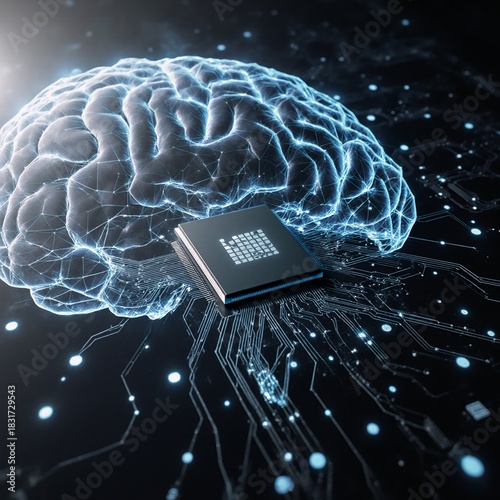 Futuristic digital landscape depicting brain-inspired AI microchip technology