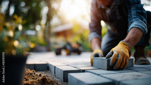 Faceless landscaper man laying interlocking paving stones creating new backyard patio defocused garden background wearing protective gloves work clothes outdoor hardscaping