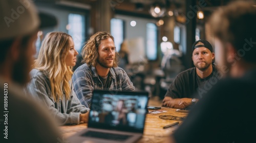 Small Team Meets Around Table to Discuss Ideas and Share Thoughts in a Modern Workspace During Daylight Hours