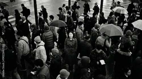 Woman in a long coat stands still and meets the viewers gaze amidst a blurred, bustling city crossing, evoking solitude, quiet individuality and urban contemplation