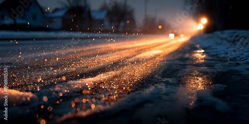 Mokra ulica o zmierzchu odbijająca migoczące światła przejeżdżających samochodów w miejskim otoczeniu