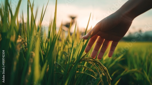 Hand Gently Touching Green Rice Plant in Golden Field Under Soft Sunset Light Promoting Sustainable Agriculture and Connection with Nature