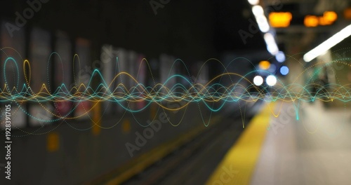 Floating colorful waveform flowing over subway platform with train tracks, yellow strip, lights