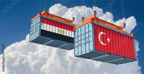 Freight container with Egypt and Turkey national flag. 3D Rendering