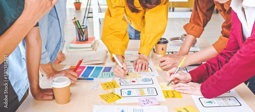 Young Asian business creative team work together, mobile application software design project. Brainstorm meeting, internet technology, smartphone web app designer, office coworker teamwork concept