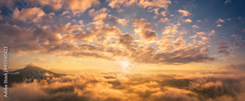 Mountains in low clouds at sunrise in summer. Aerial view of mountain peak in fog. Beautiful landscape with high rocks, forest, colorful sky. View from above of mountain valley in clouds. Foggy hills