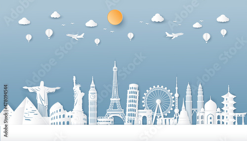 Travel famous landmarks around world in paper cut. postcards europe,america asia. vector illustration in origami craft style.