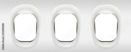 Photo of the windows of an airplane from inside (flight concept), 3 porthole frames isolated on transparent background, png file