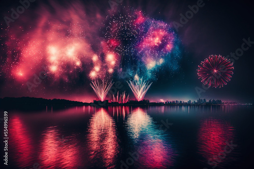 Piękne sztuczne ognie nad zatoką z panoramą miasta