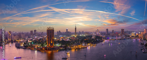 Wonderful purple sunset panorama of the Nile and Gezira island in Cairo, Egypt