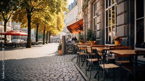 Outdoor cafe with wooden tables and chairs on a city street adorned with autumn leaves and warm sunlight.