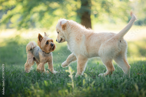 A funny golden retriever puppy meets a Yorkshire terrier puppy in the park. Active recreation, playing with dogs. A family dog. Shelters and pet stores