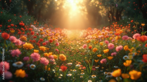 Pole kwiatów ze słońcem świecącym przez drzewa